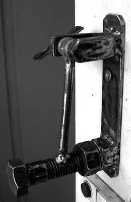 Tein aamulla ovikolkuttimen... en ole pitkään aikaan tehnytkään mitään noin yksinkertaisen "rumankaunista" ja taas onnistuin... kolkutin jopa toimii ja kolkuttaa ihan mukavasti... Tai ainakin se herättää hurjan vartiokoiramme, joka sitten herättää meidät...olen tyytyväinen... tyytyväisempi kuin mitä olisin, jos olisin hankkinut HongKongista valetun leijonanpäisen ovikolkuttimen... pitännee aloittaa muutenkin tässä värkkäilemään pienoisveistoksia kun mihinkään ei enää mahdu mitään suurempaa säilöön... Ei sillä että tuo kolkutin nyt mikään pienoisveistos olisi, mutta kun sen kääntää vaaka-asentoon ja valmistaa vaikkapa puusta ja kasvattaa koon vaikkapa kaksimetriseksi, niin johan alkaa tuo "vasaraefekti" saamaan uskottavuutta... kun sinne vielä asettaa jonkun haavoittuvan objektin odottelemaan vääjäämätöntä, niin jopas taas on saatanasti sisältöä ja sanottavaa...